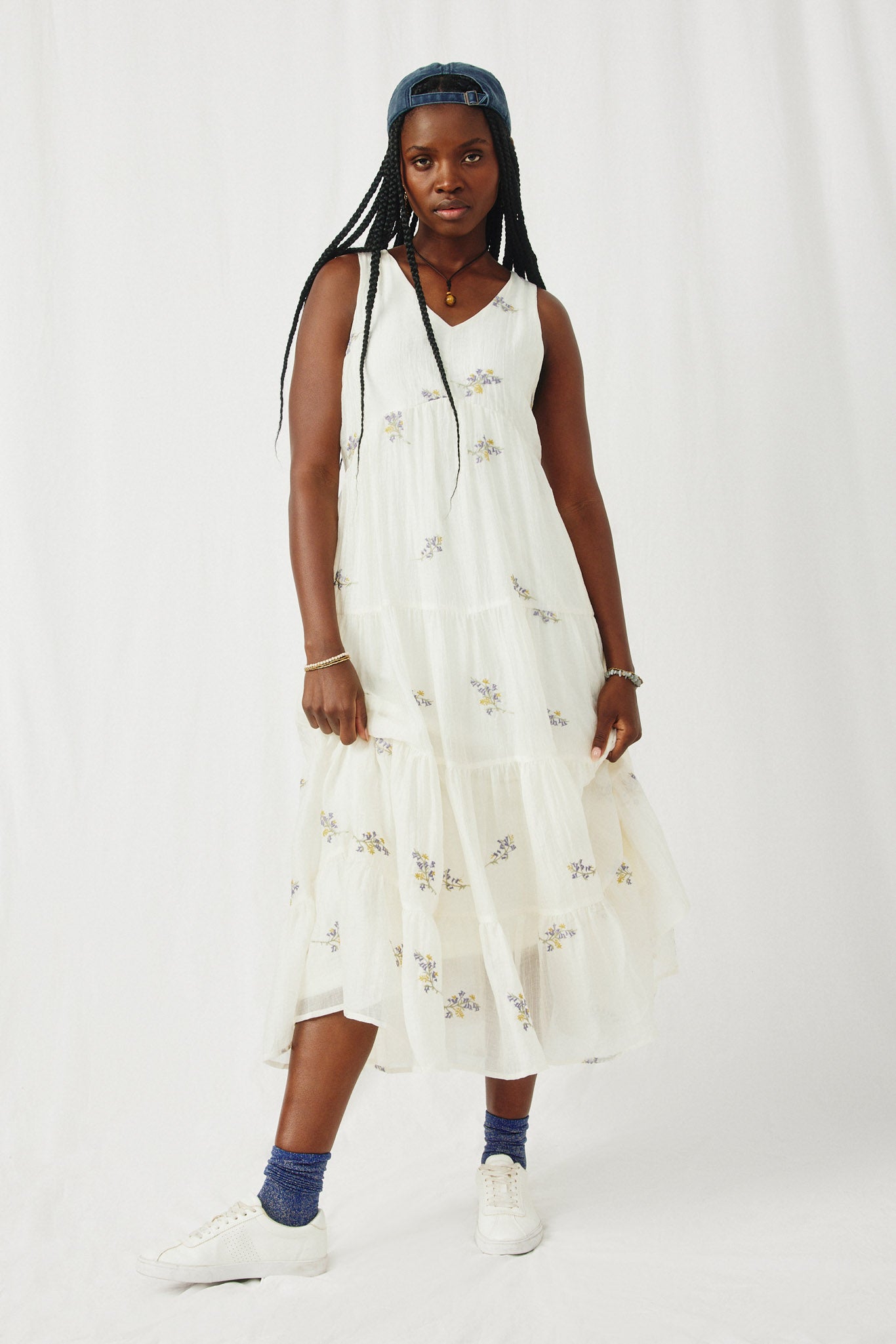 Ditsy Floral Embroidered V Neck Tiered Dress