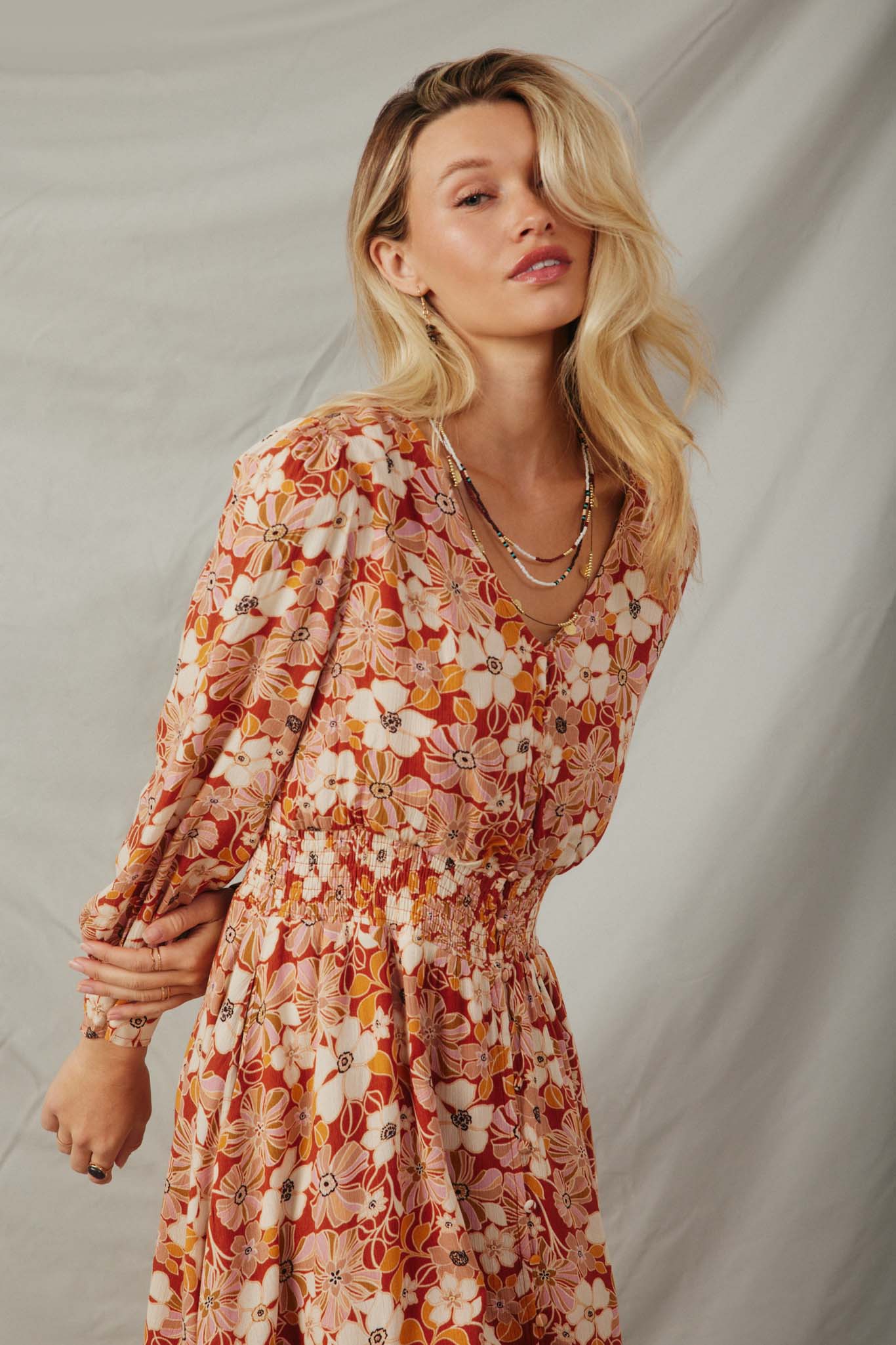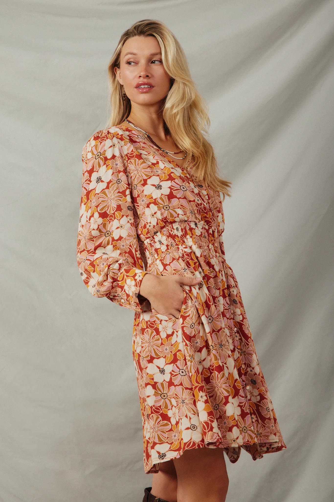 Our Floral Print Button Up V Neck Smock Detail Dress Features: