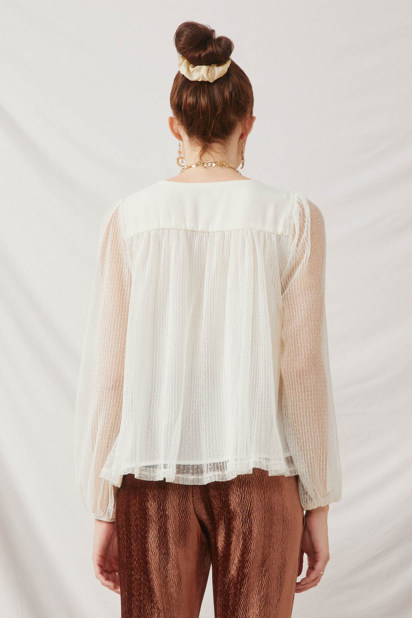 Our Textured Stripe Flowing Chiffon Buttoned Top Features: