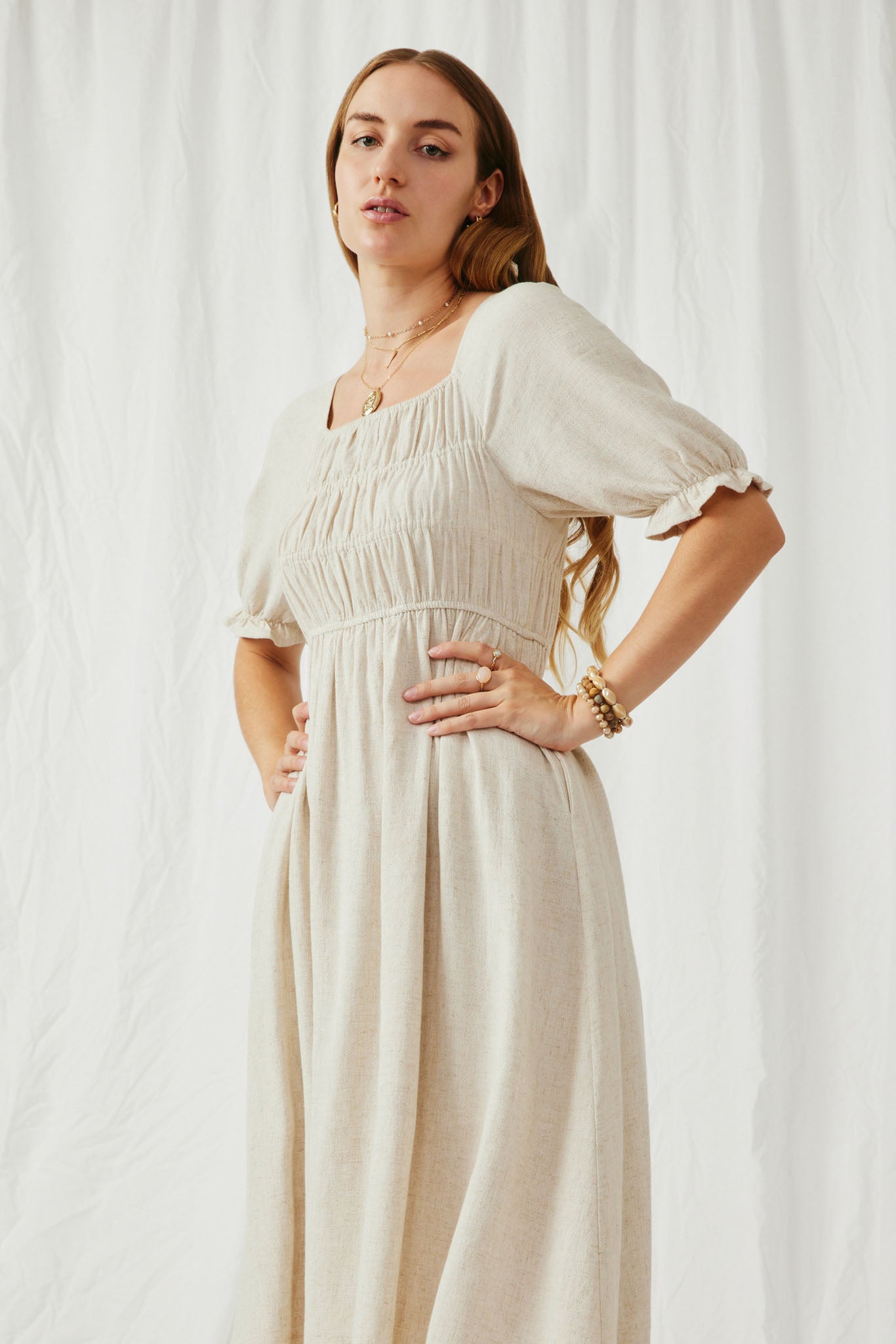 Our Linen Blend Peasant Smocked Square Neck Dress Features: