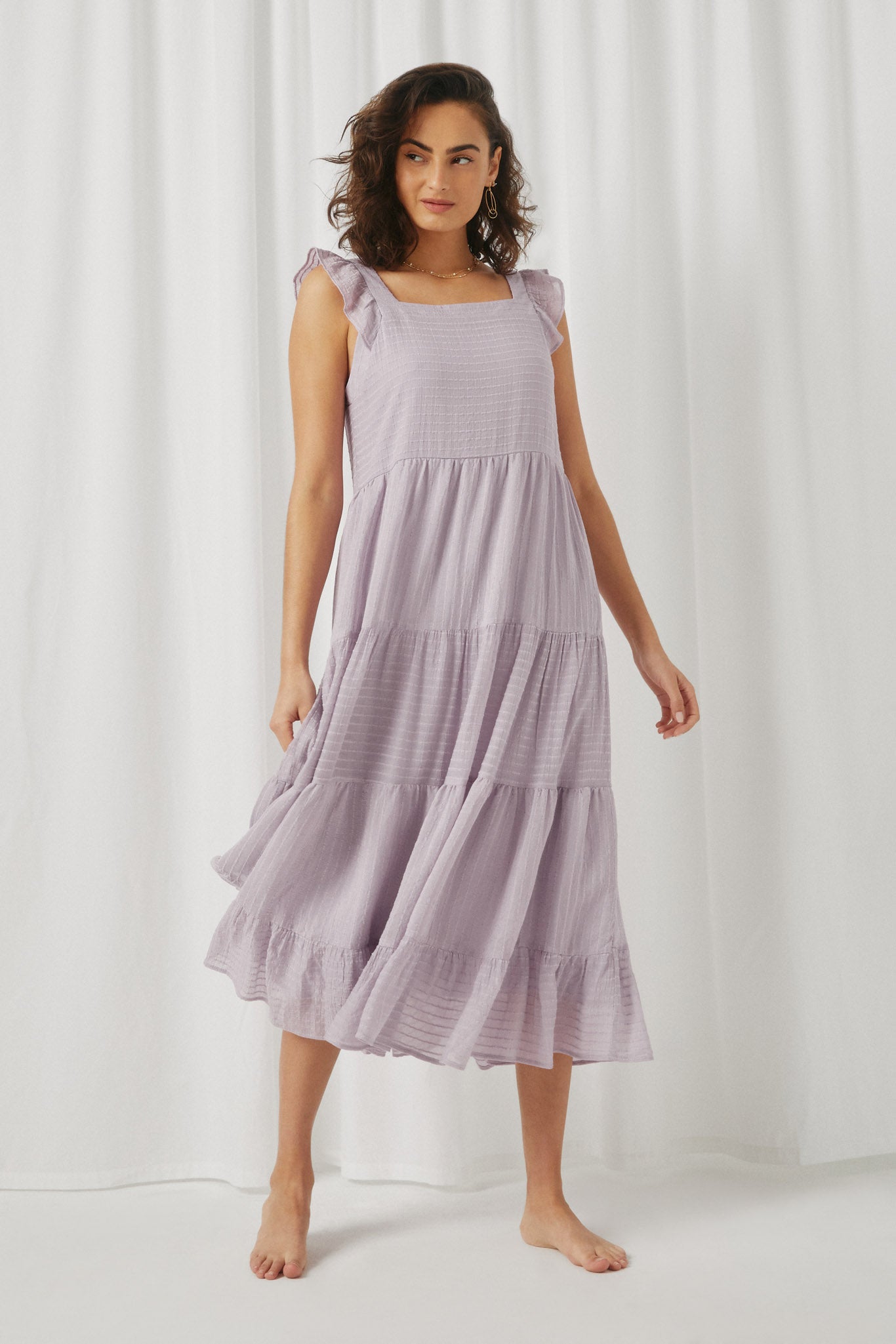 Textured Stripe Ruffle Sleeve Button Detail Tiered Dress