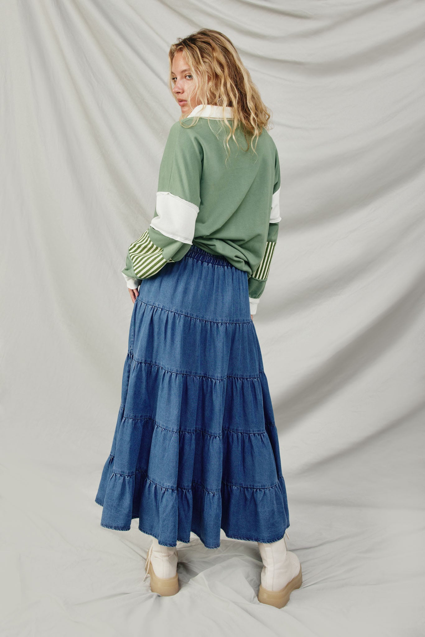 Our Elastic Waist Tiered Denim Skirt Front Features: