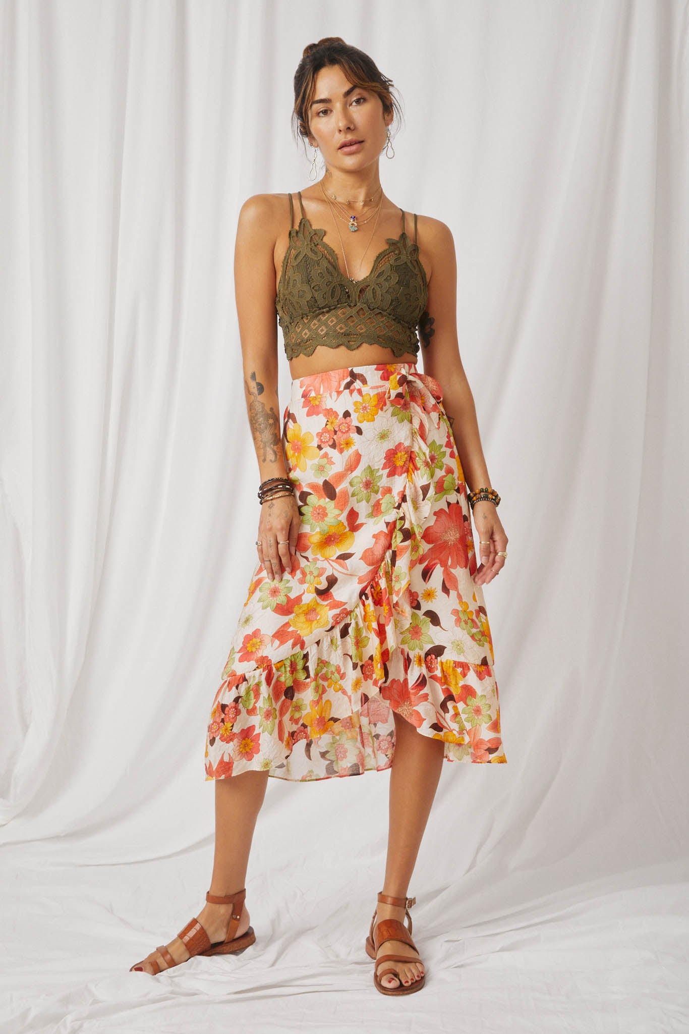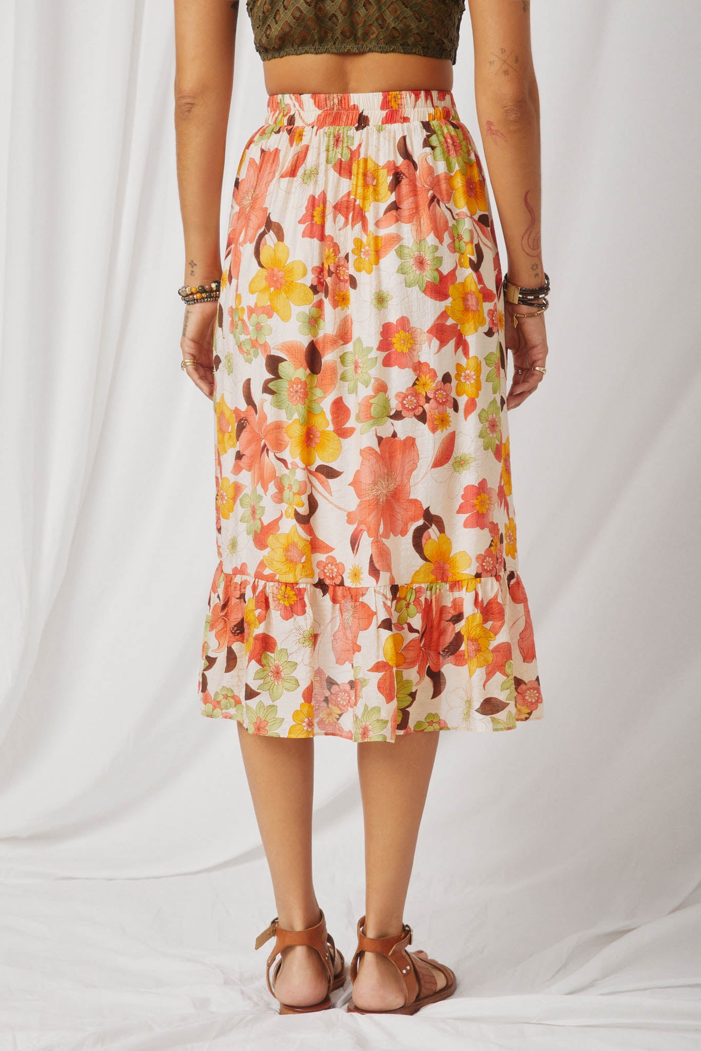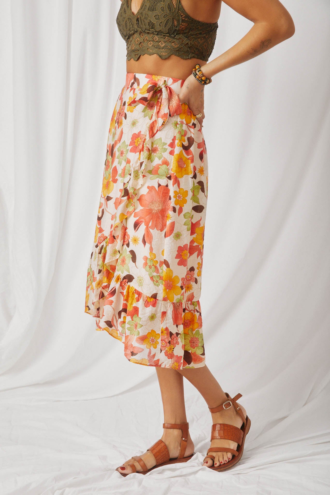 Our Textured Bold Floral Asymmetric Ruffle Tie Skirt Features: