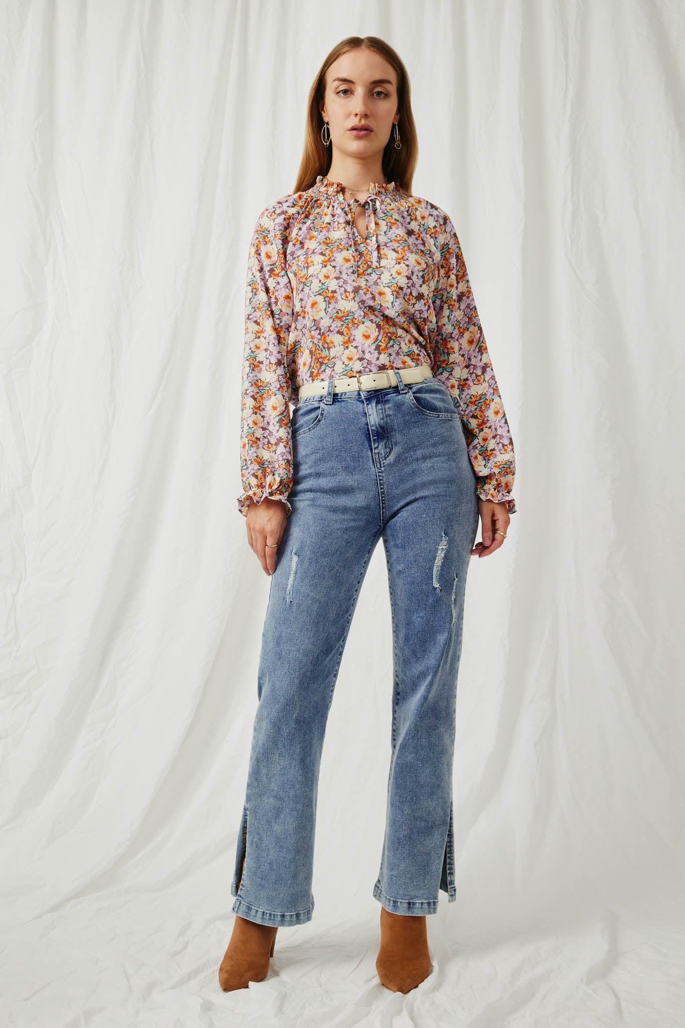 Our Floral Cinch Cuff Smock Collar Tie Front Top Features: