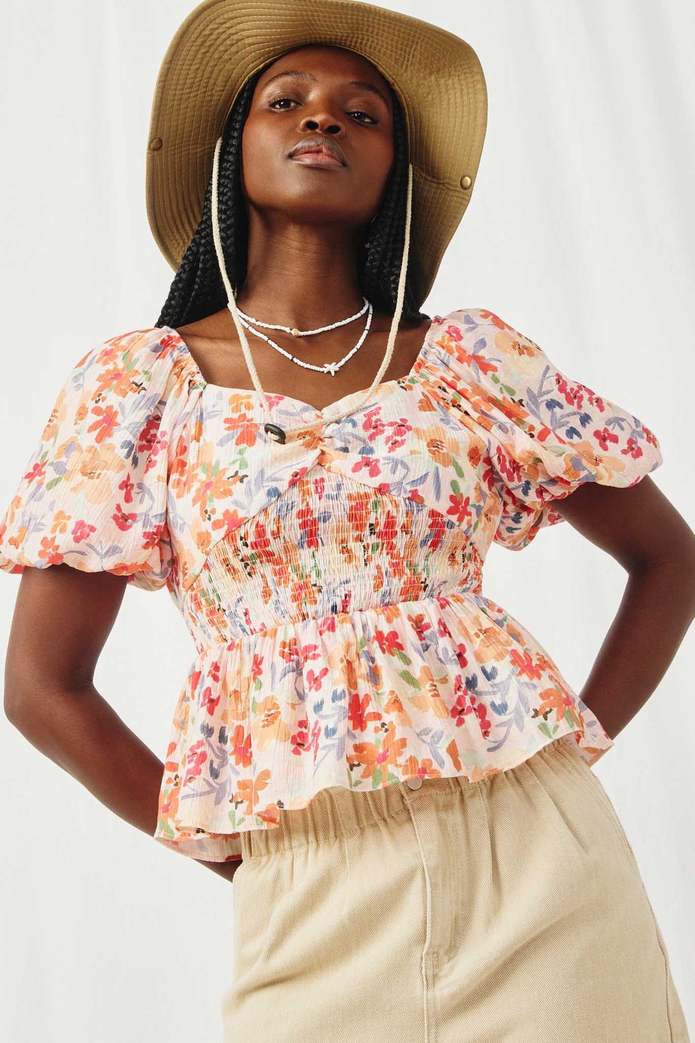 Our Floral Smocking Paneled Puff Sleeve Top Features:
