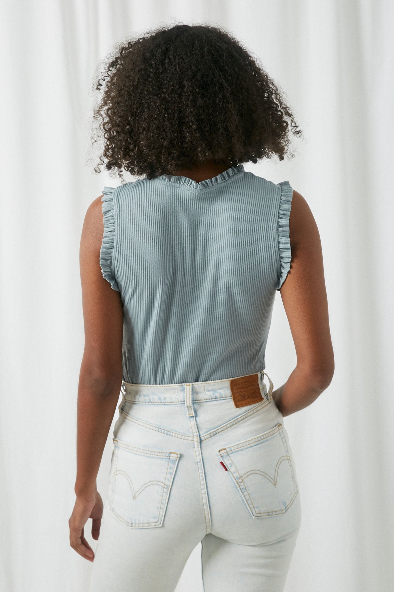 Product Details:Our Ruffle High-Neck Tank Top Features: Ribbed Cotton Stretch Ruffle High Neck Collar Pull-On Silhouette Measurements: Size Length Chest Waist Small 24.75" 16.5" 14.5" Medium 25.5" 17.5" 15.5" Large 26.25" 18.5" 16.5" The measurements in the chart above reflect...