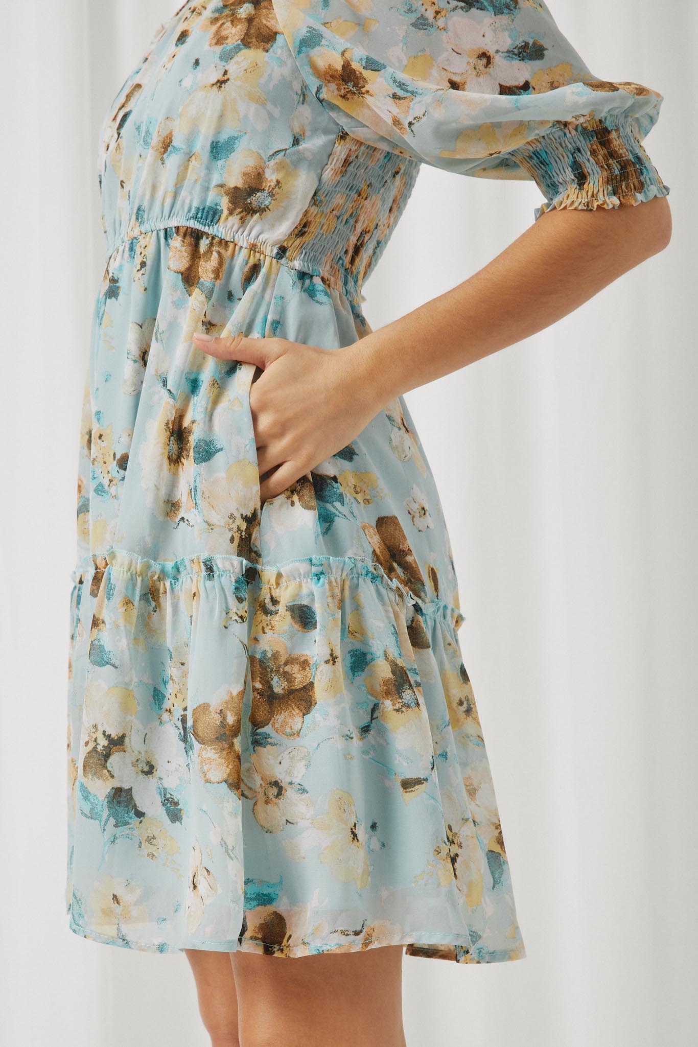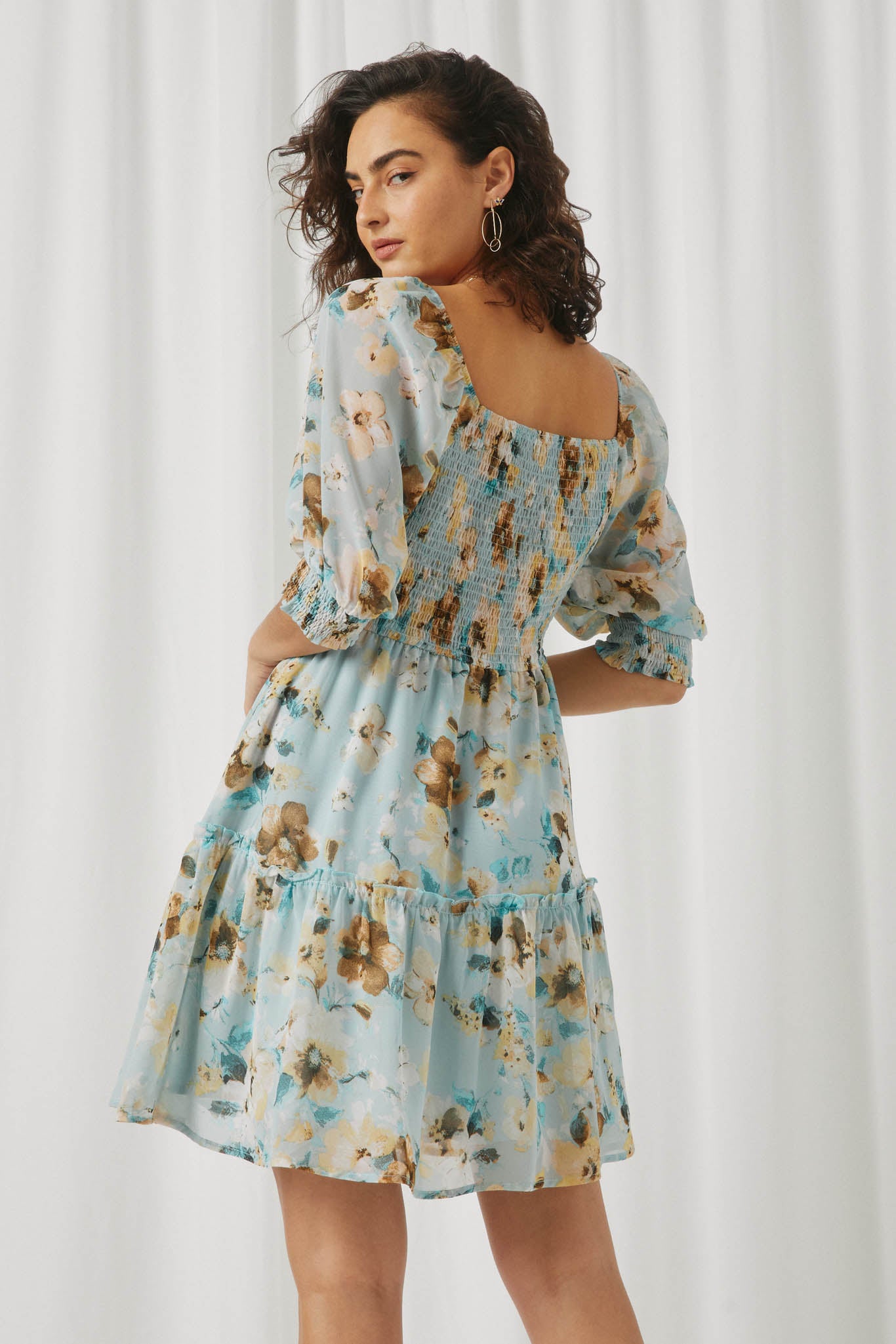 Floral Chiffon Smocked Cuff Square Neck Dress