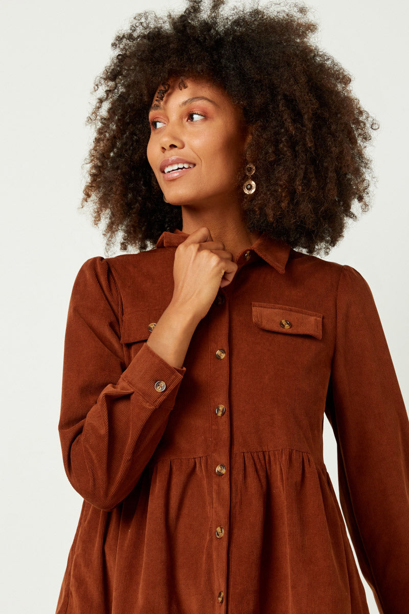 Our Corduroy Button Up Tiered Mini Dress Features: