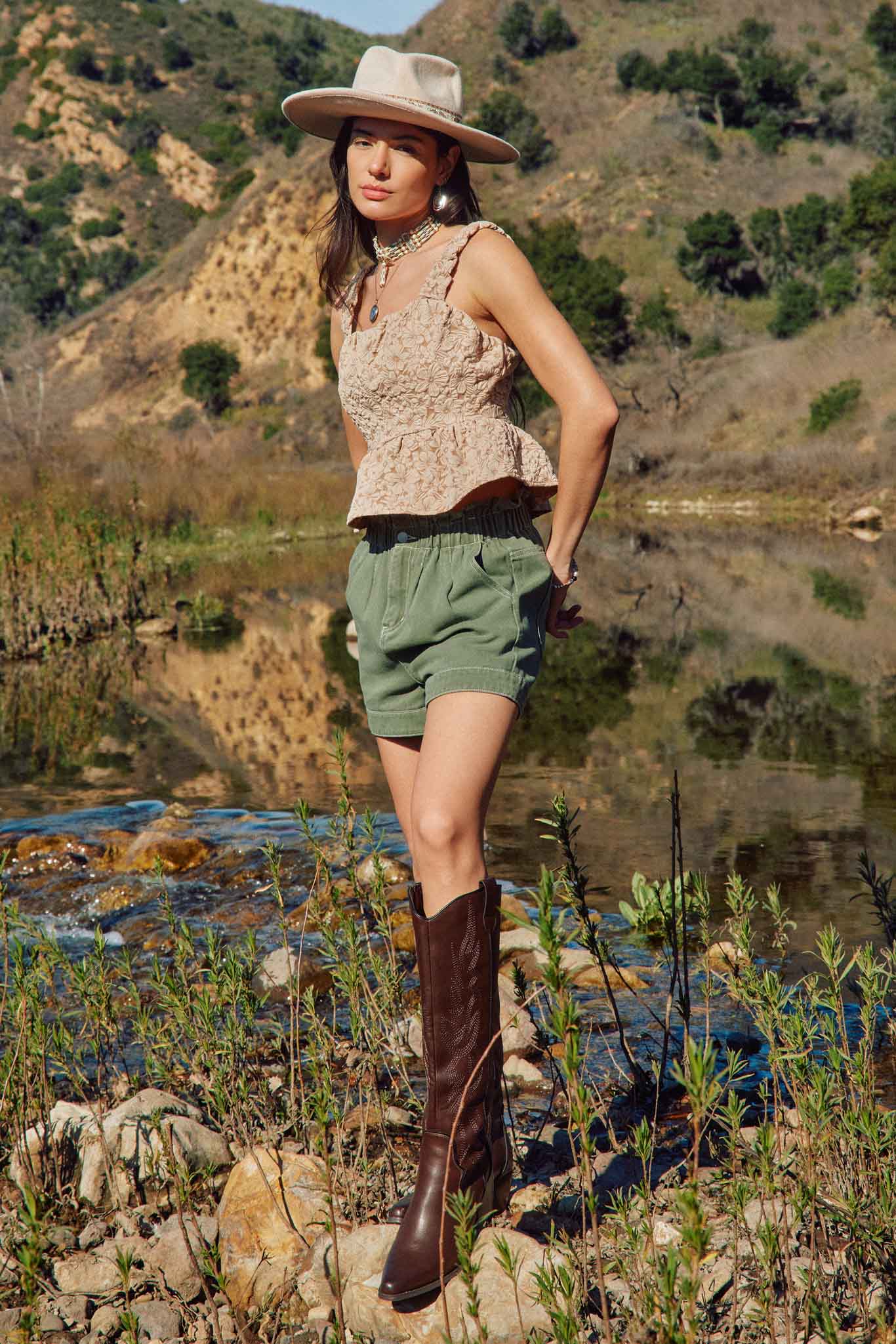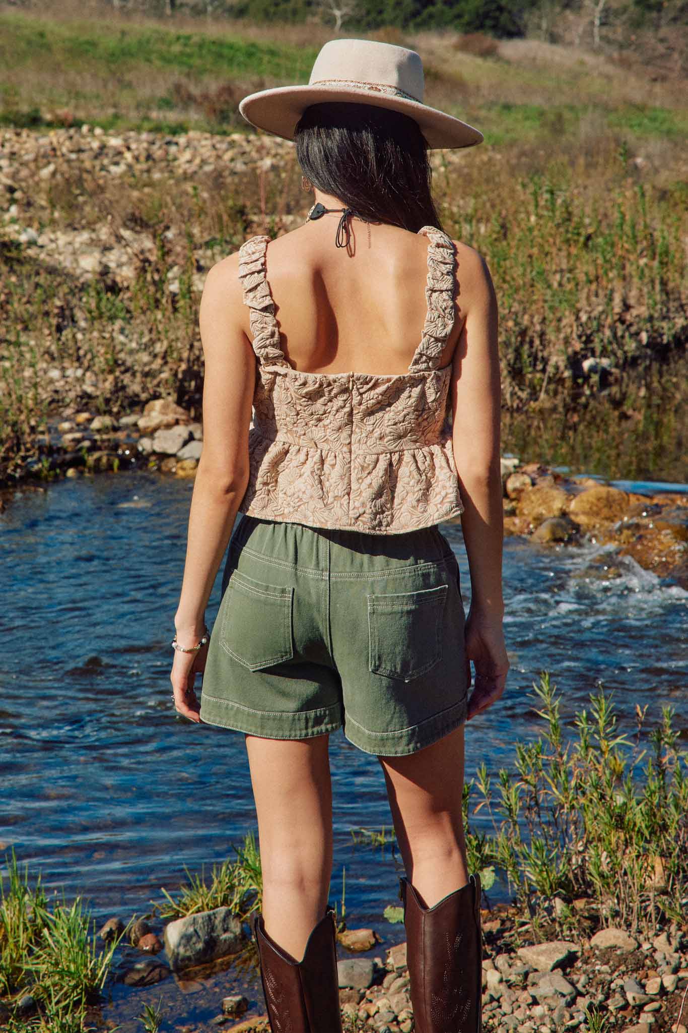 Our Floral Embossed Elastic Strap Cropped Peplum Top Features: