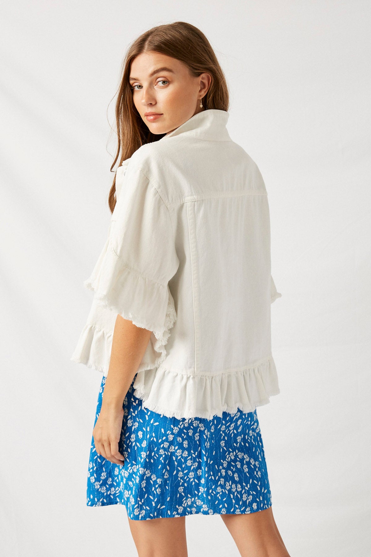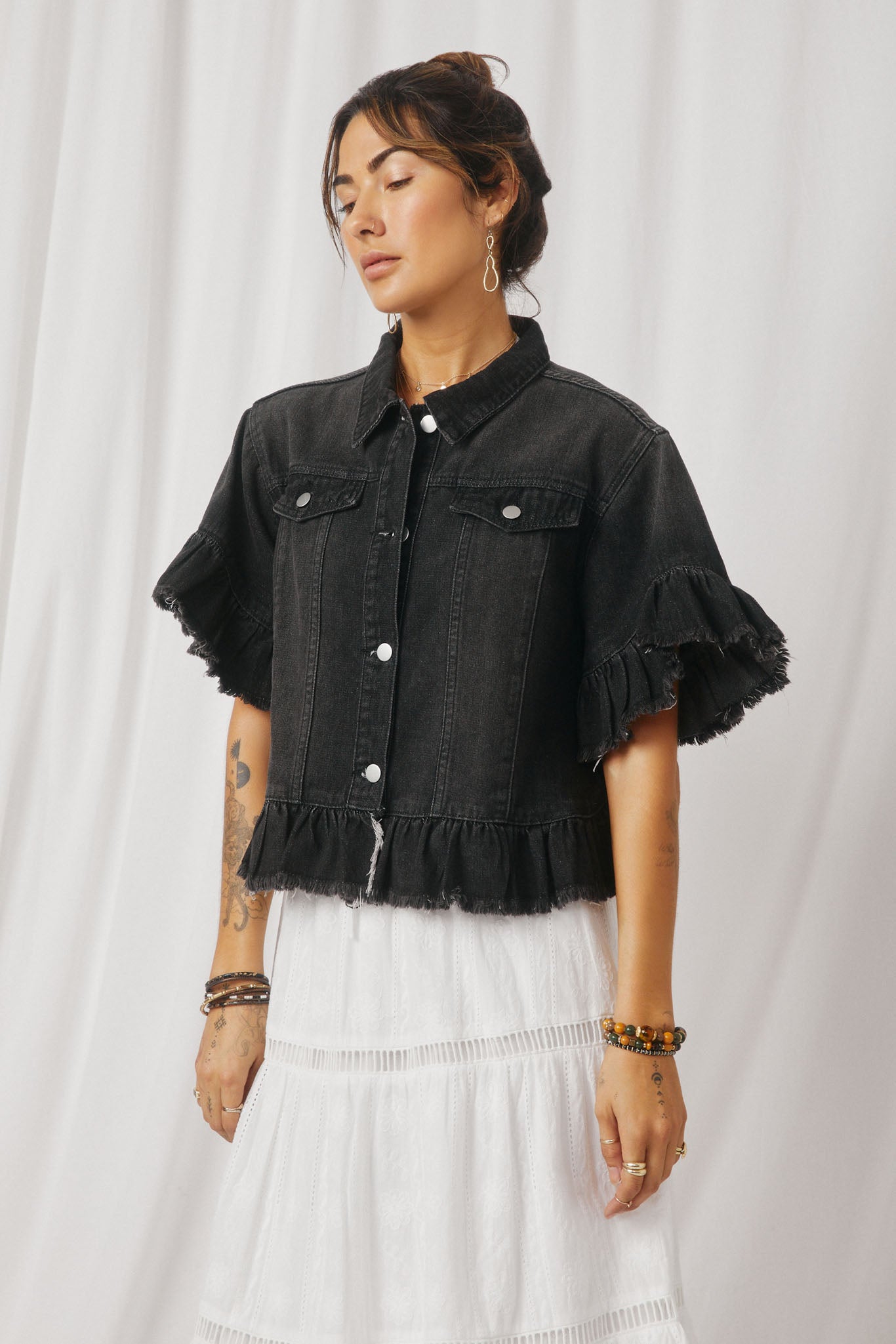 Our Ruffle Stonewash Denim Jacket Features: