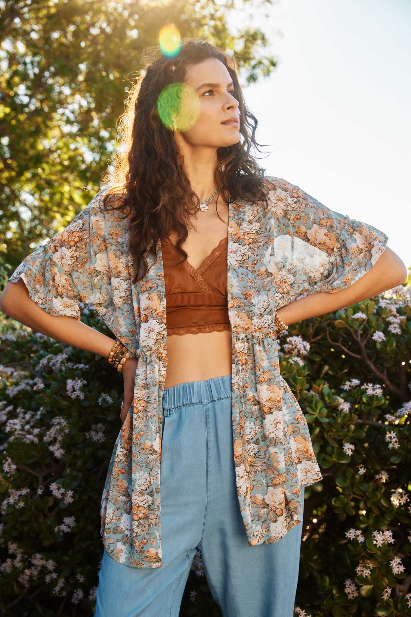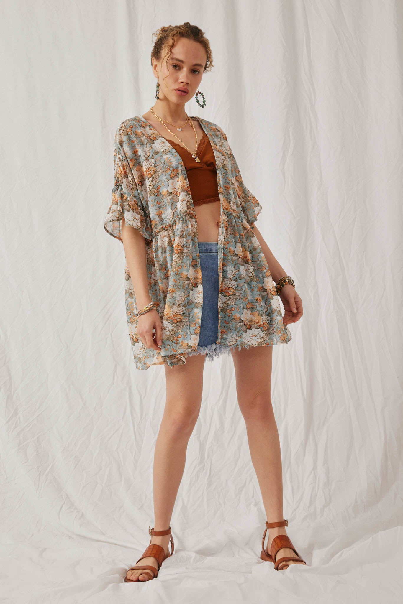 Our Ruffled Sleeve Floral Print Open Kimono Features: