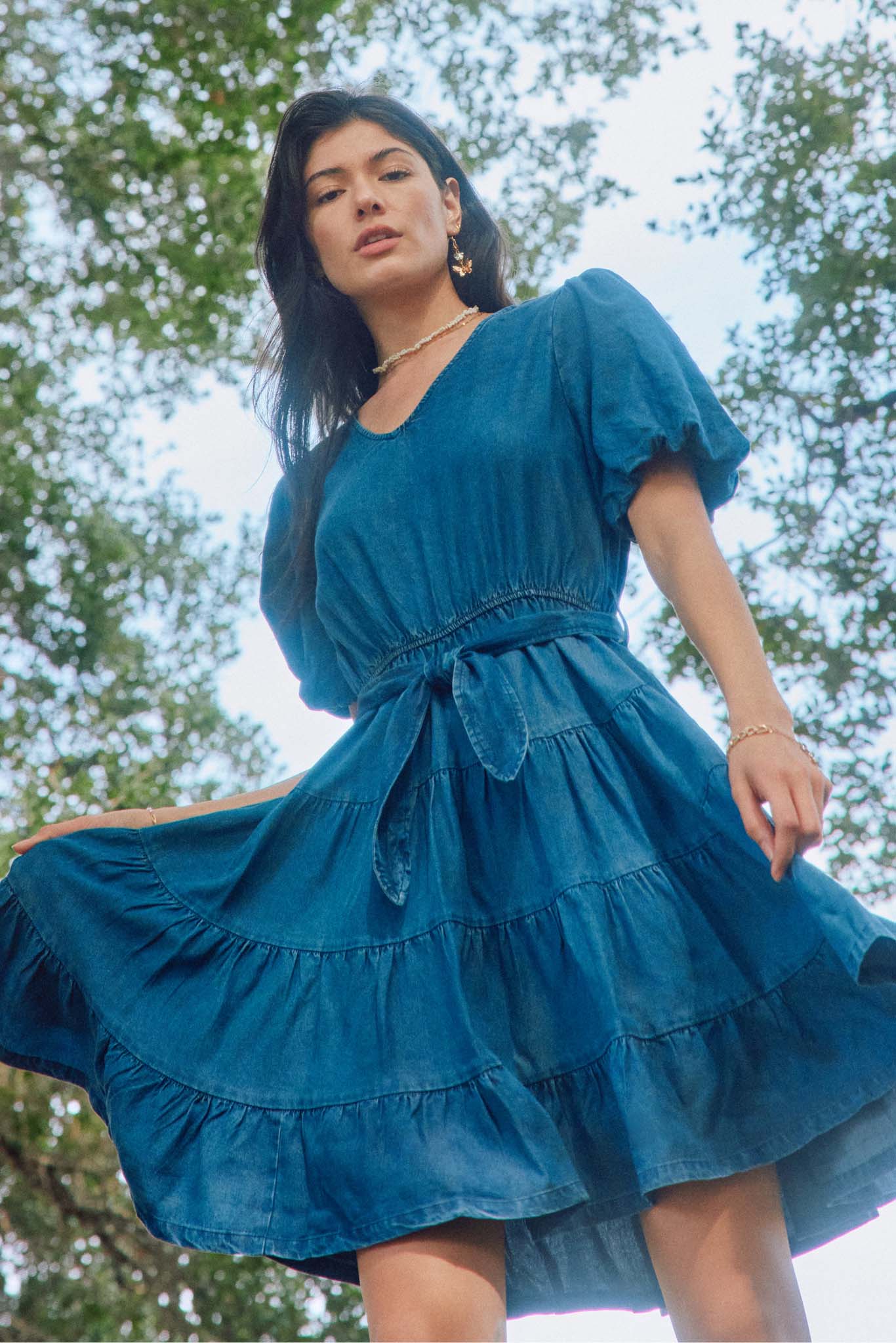 Our Denim Washed Belted V Neck Dress Features: