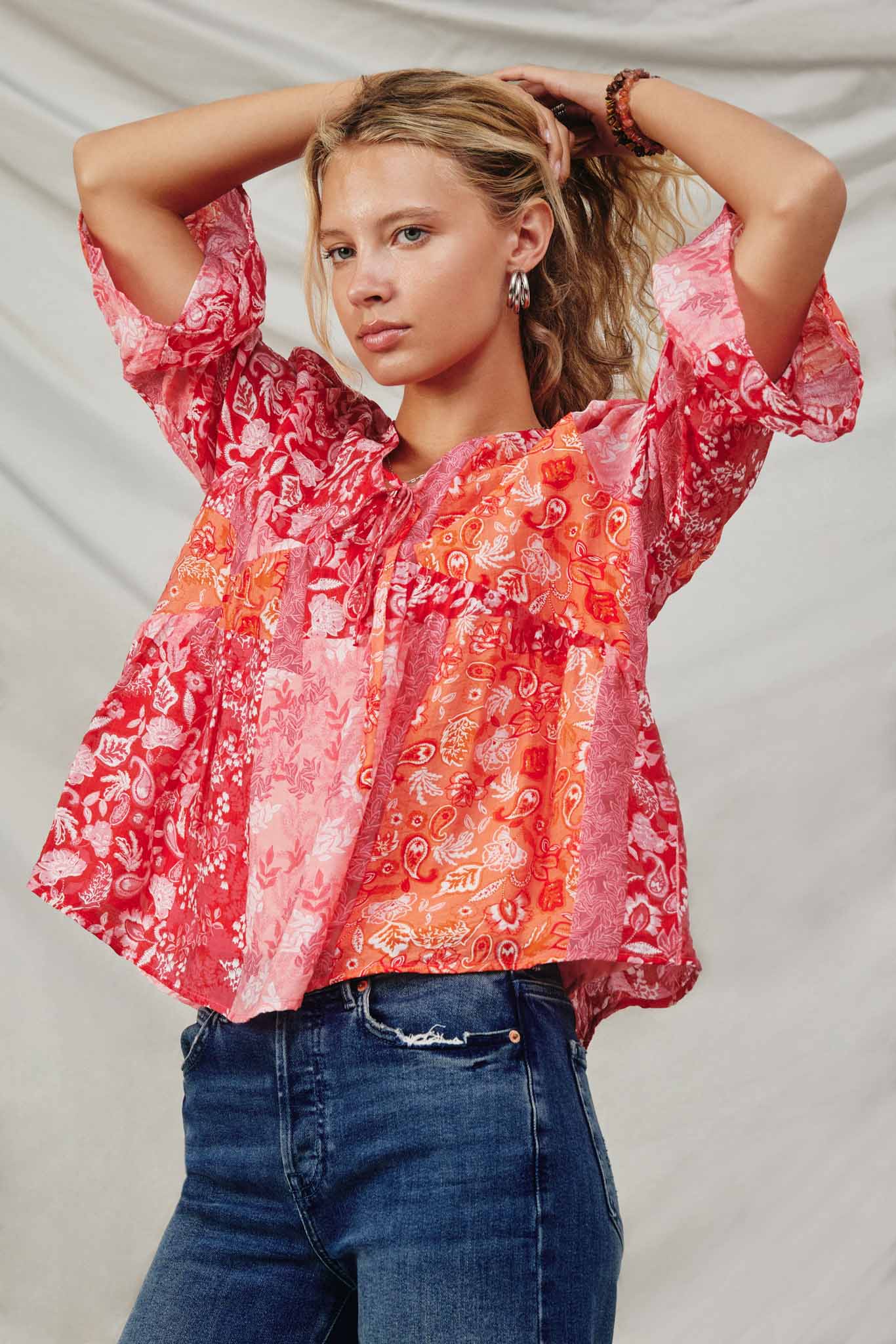 Our Print Blocked Cinch Sleeve Baby Doll Top Features: