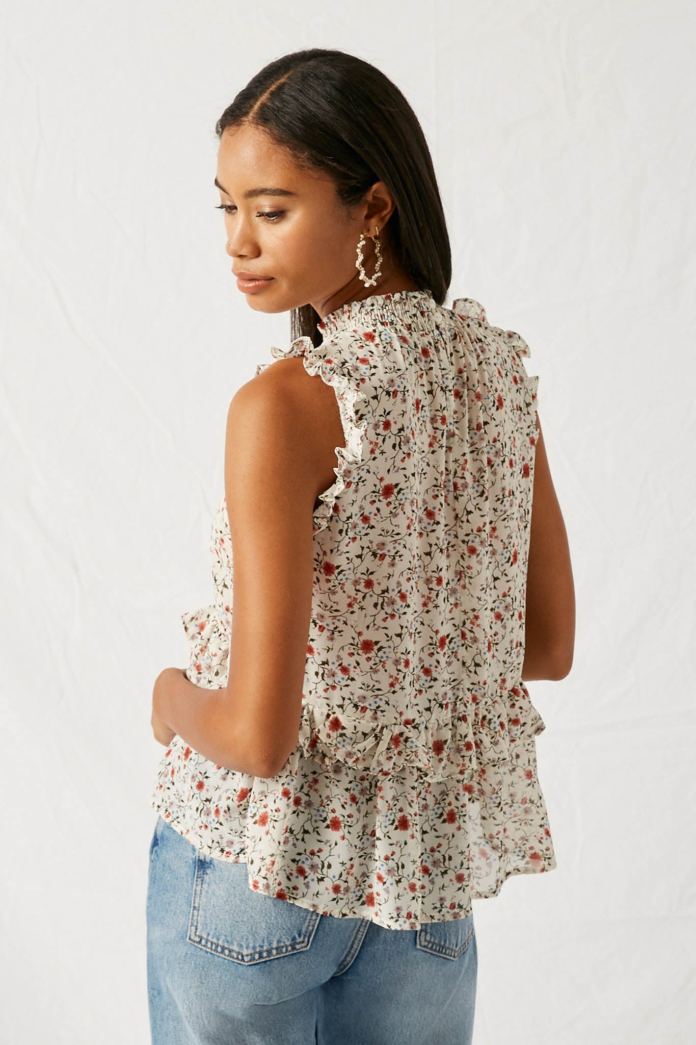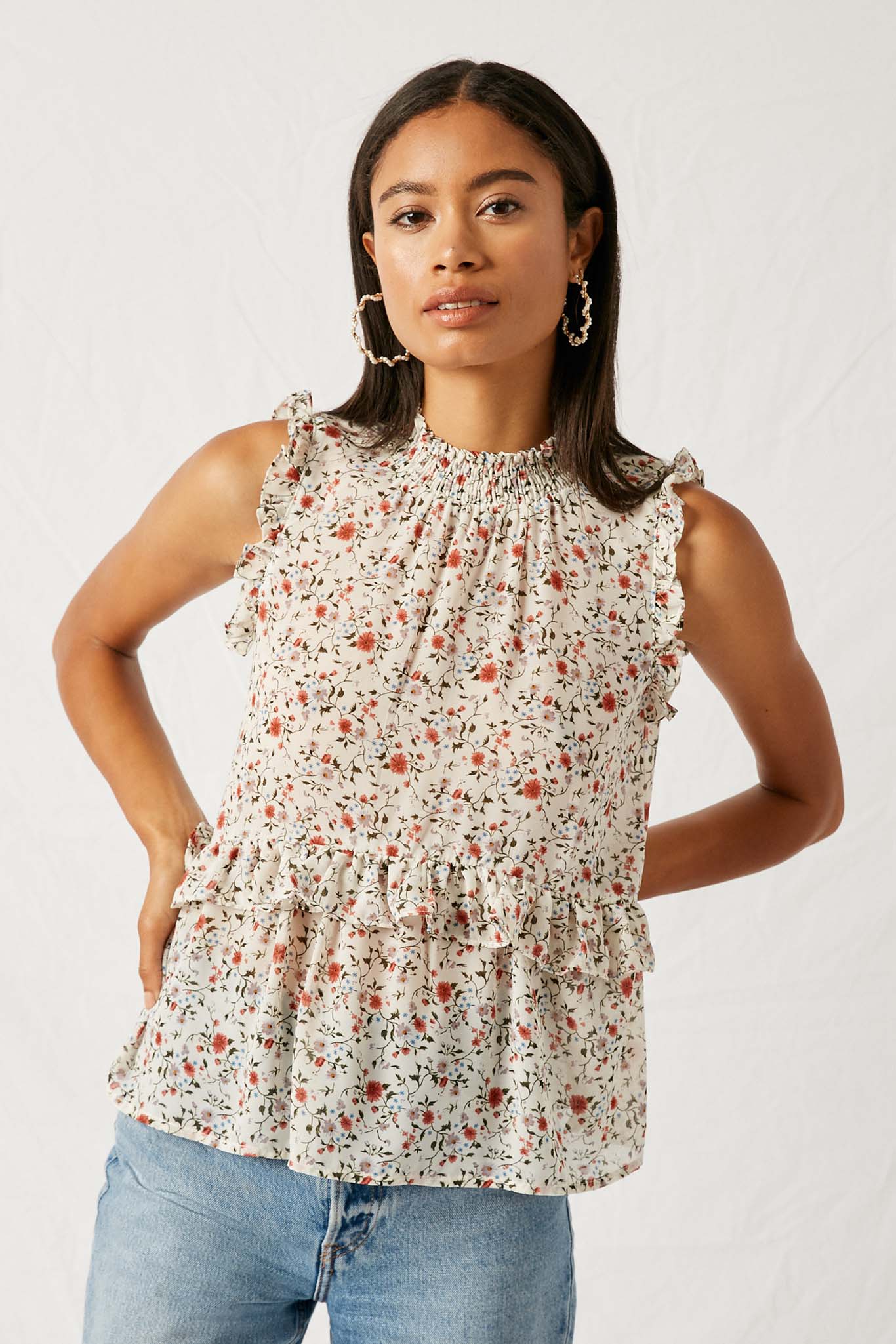 Floral Smock Neck Ruffle Top