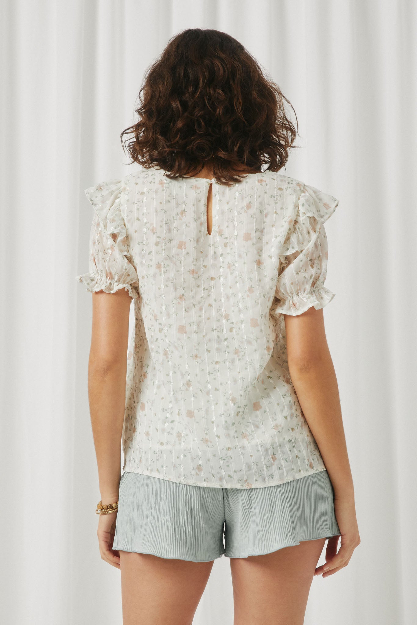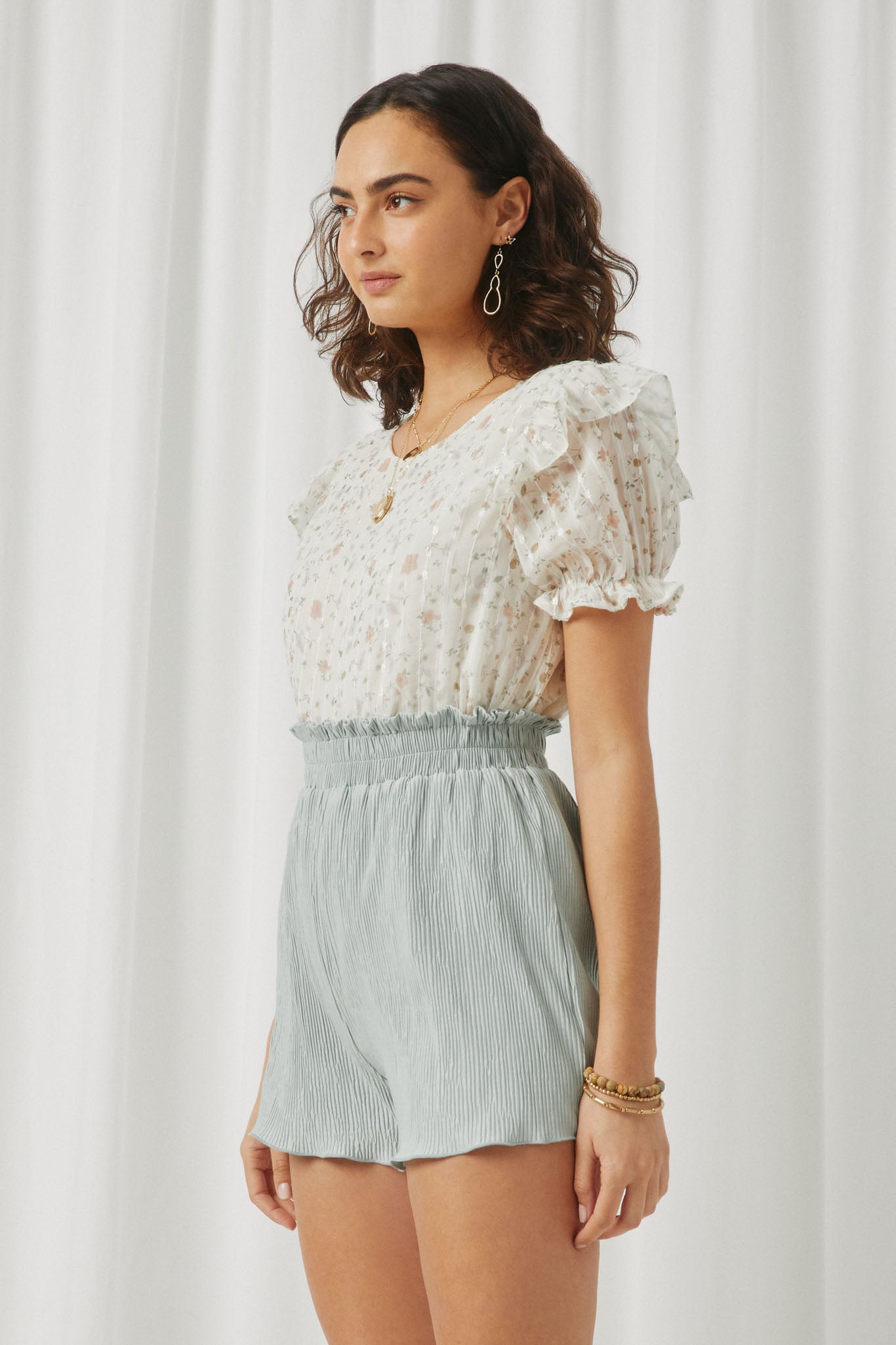 Our Textured Lurex Detail Printed Ruffle Top Features: