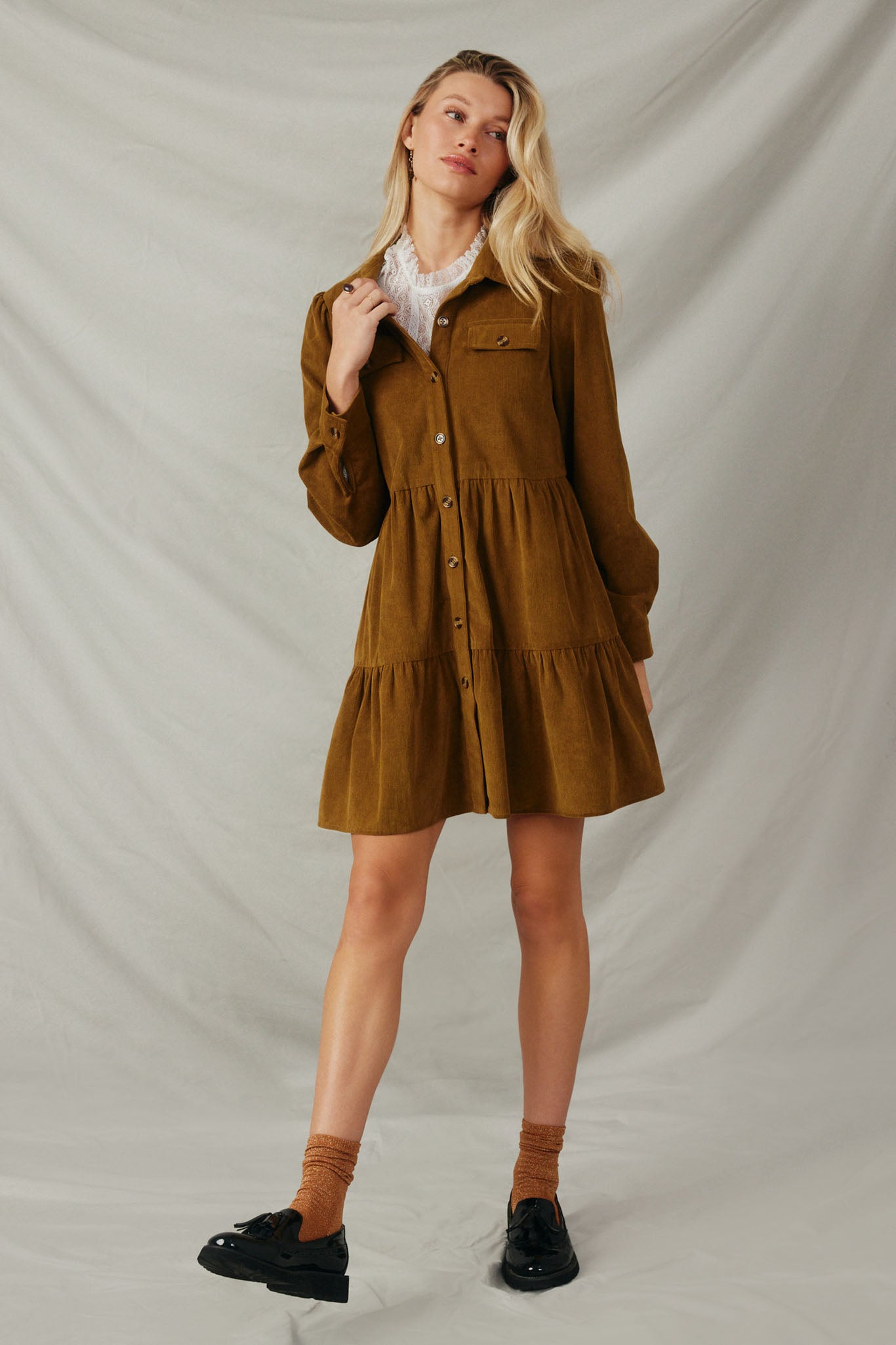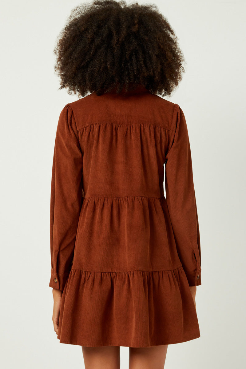 Our Corduroy Button Up Tiered Mini Dress Features: