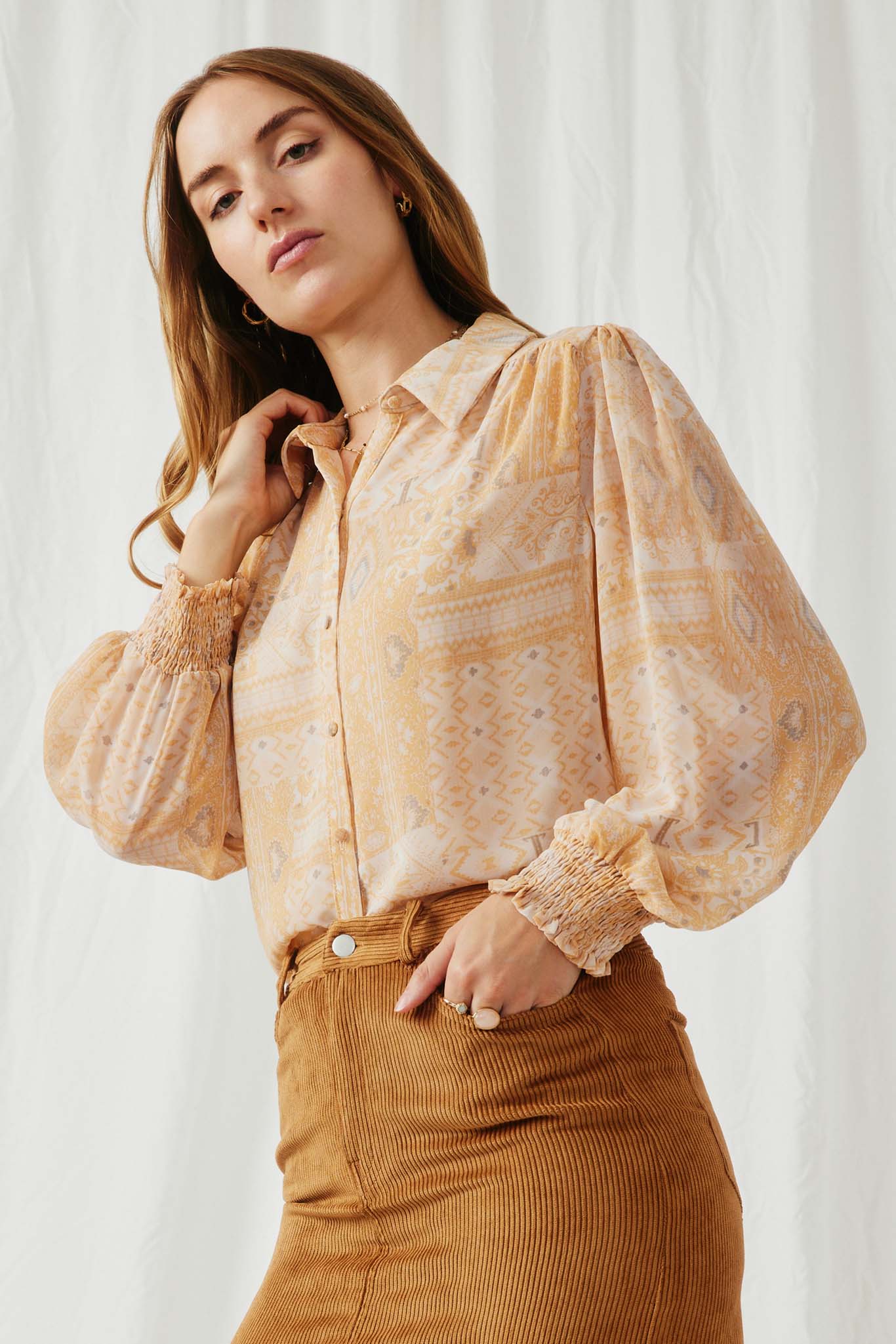 Our Patch Print Smocked Cuff Collared Shirt Features: