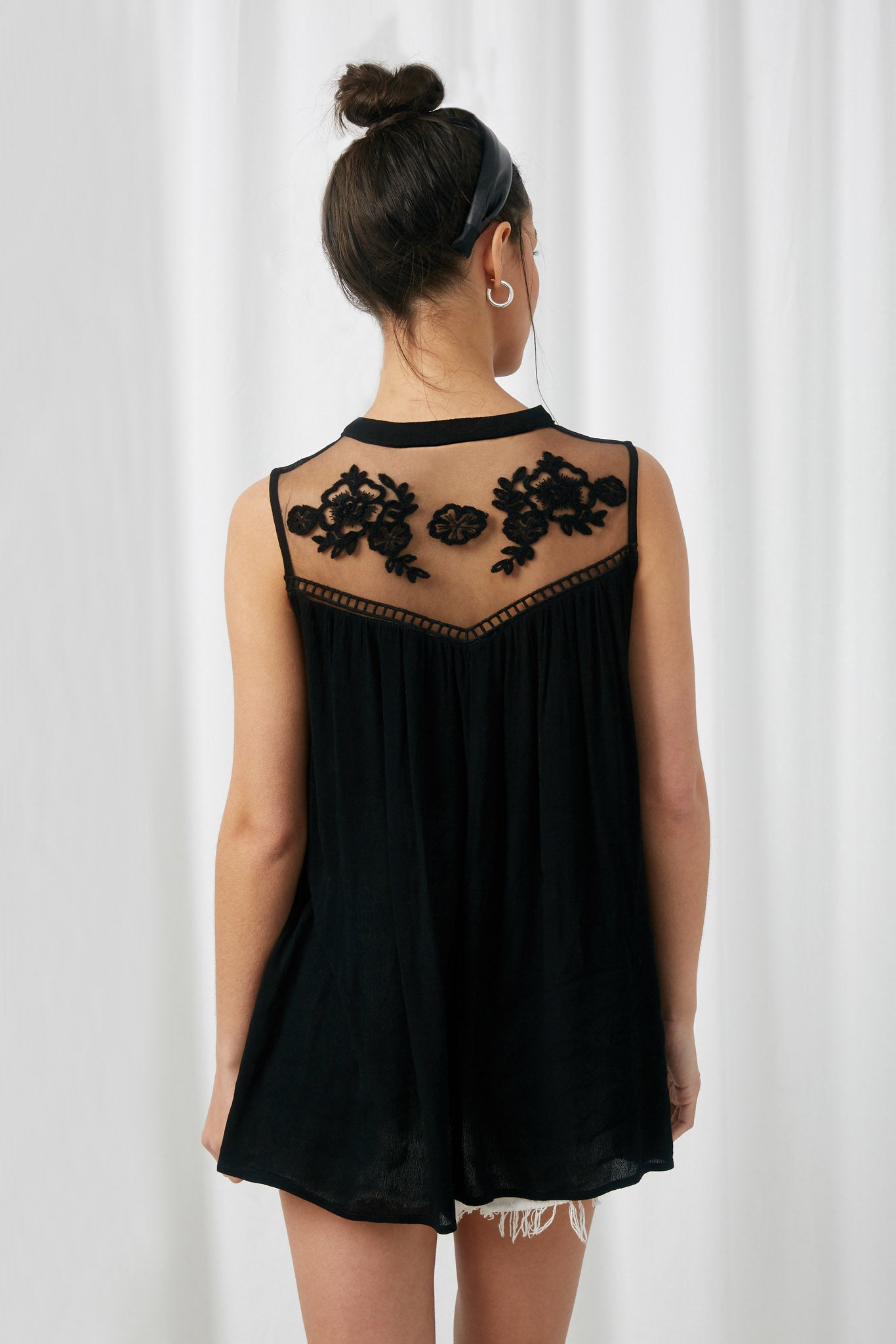 Our Sleeveless Embroidered Mesh Yoke Top Features: