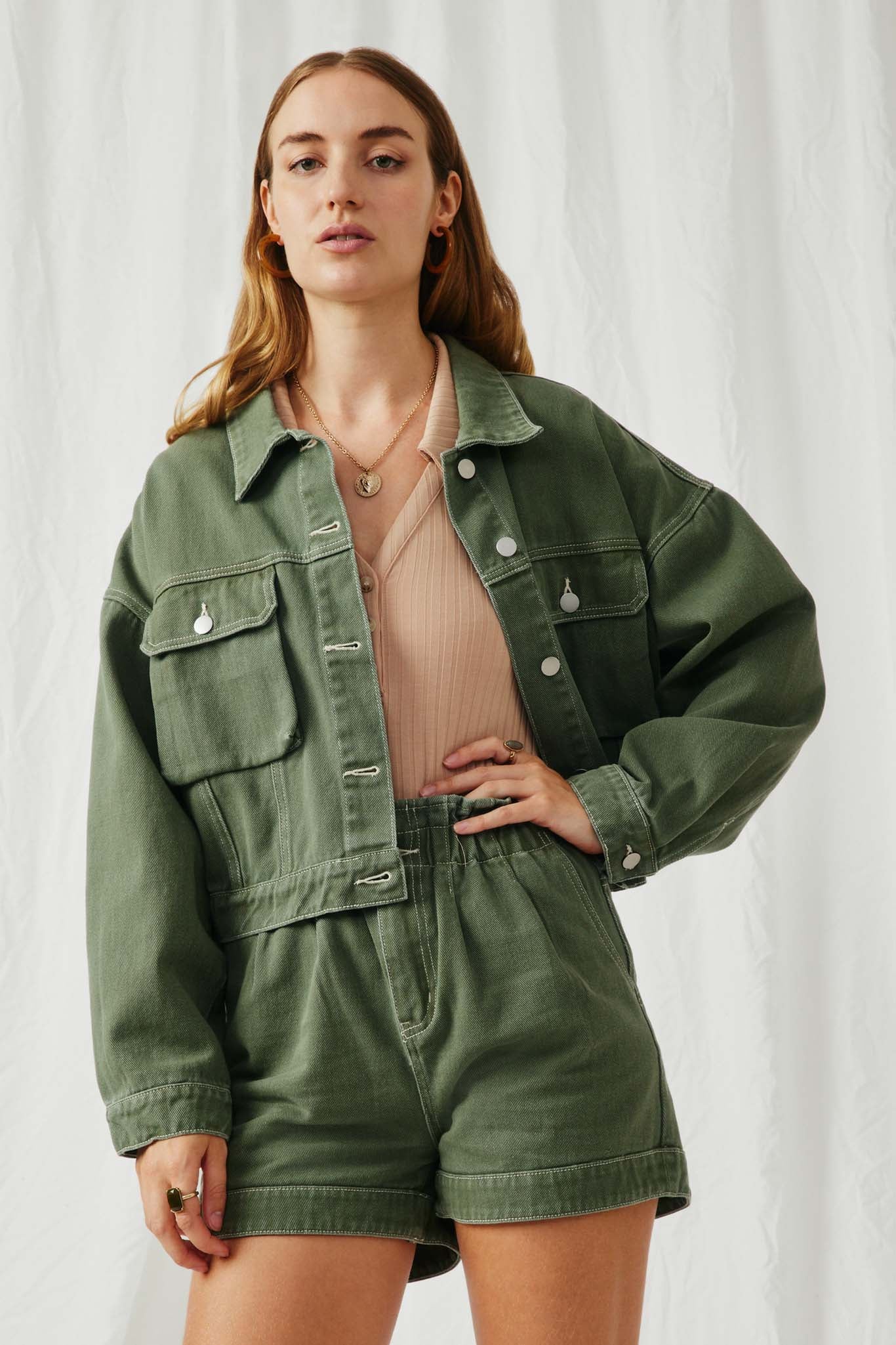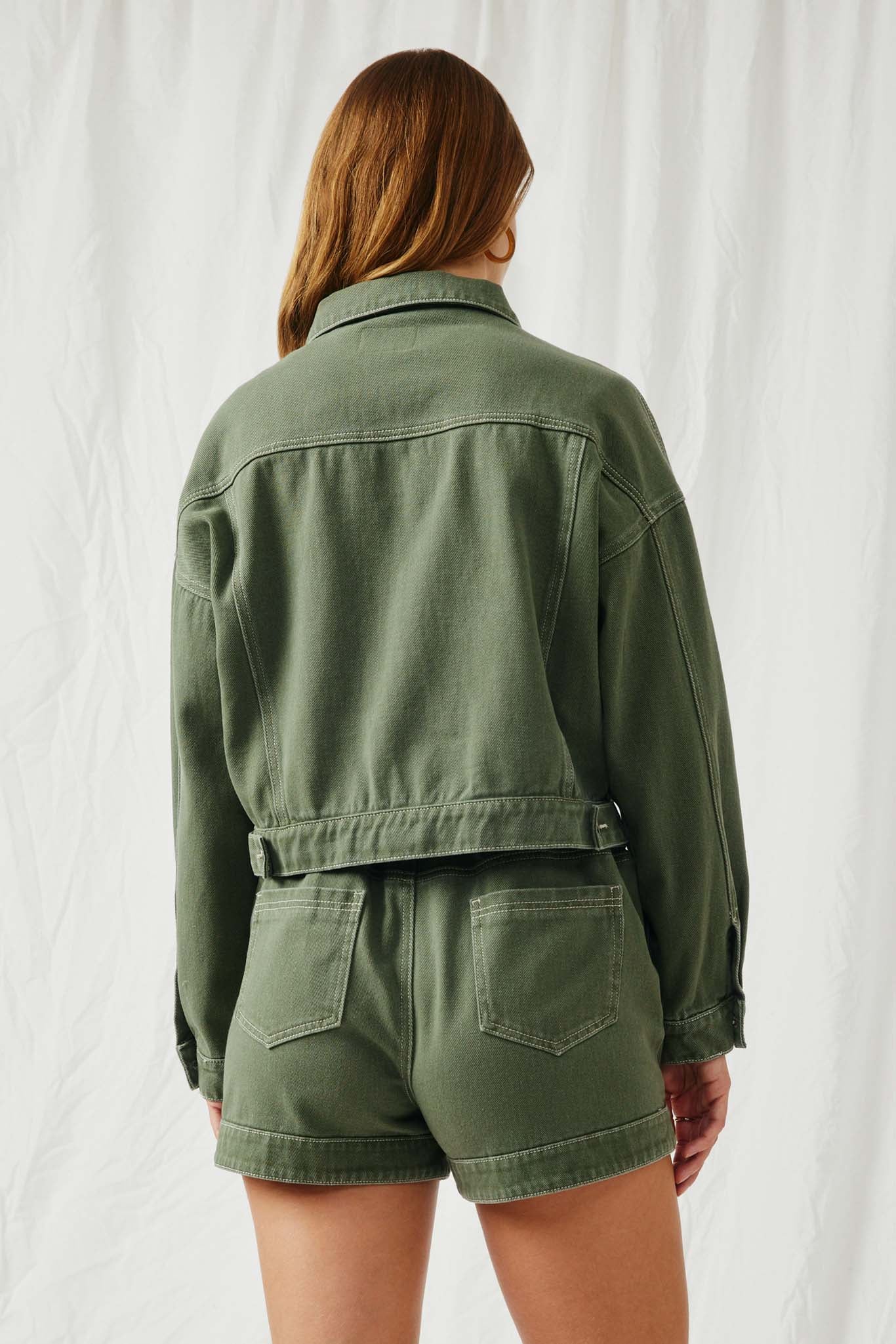 Our Washed Cargo Pocket Contrast Stitch Colored Denim Jacket Features:
